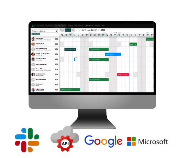 Die Integration mit unserer offenen API kann individuell an die Bedürfnisse des Kunden angepasst werden. Standardmäßig bieten wir direkte Anbindungen zu Google, Microsoft und Slack an.